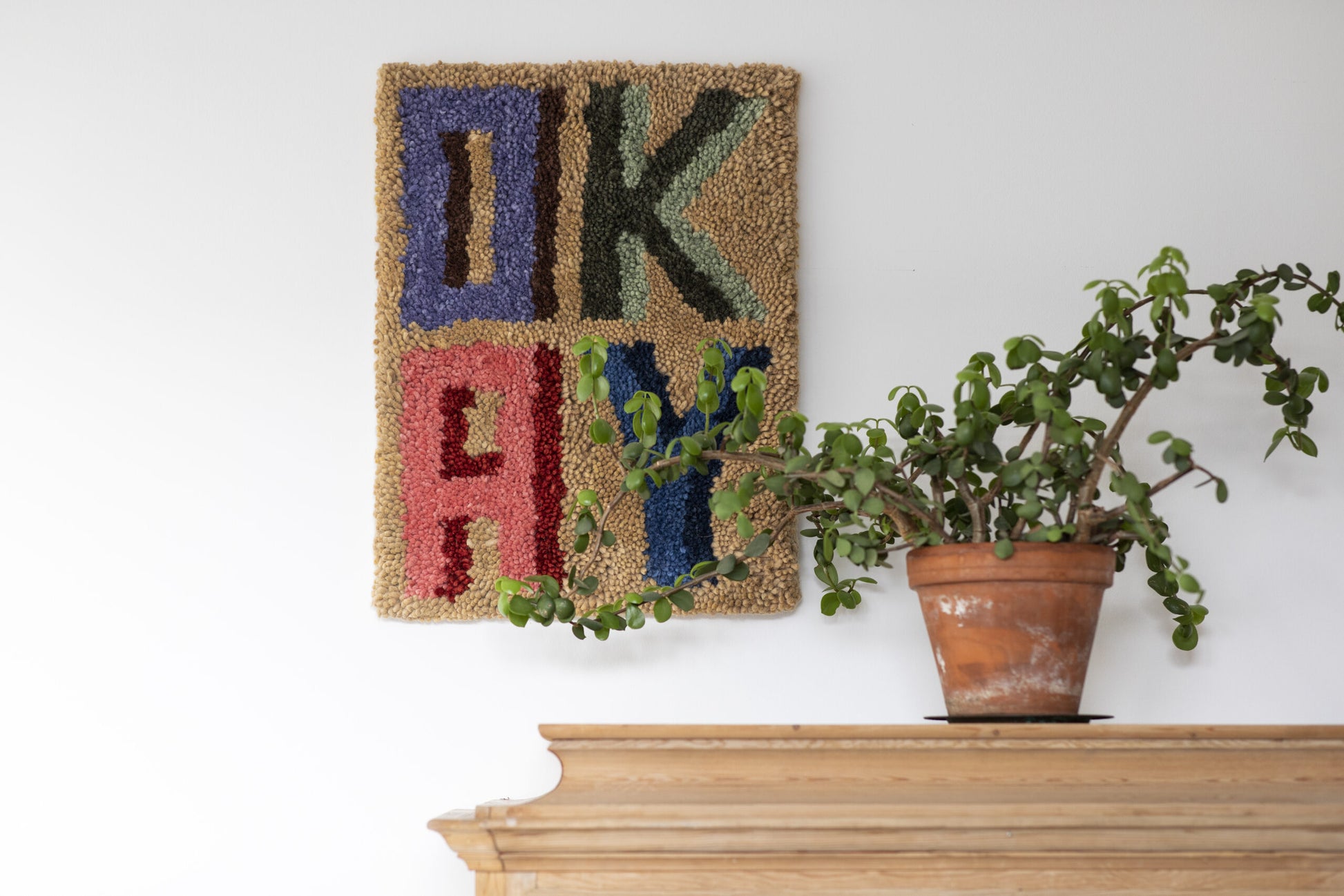 OKAY 이라는 글자가 새겨진 4글자 벽 러그는 100% 울 소재로 수작업으로 짜여져 있습니다. 핸드메이드 제품의 품질, 퀄리티와 인도의 장인 정신이 깃들어져 시선을 사로잡는 컬러감과 세련된 심플한 디자인의 아이템입니다. OKAY 러그는 집 어느 공간에서든 자유롭게 캐주얼하게, 러그 또는 인테리어 소품의 매치가 필요한 공간에 자연스럽게 녹여들 수 있는 이쁜 제품입니다. 러그 뒷면에는 벽에 걸 수 있는 걸이가 되어 있어 어디든 쉽게 디스플레이를 할 수 있습니다.