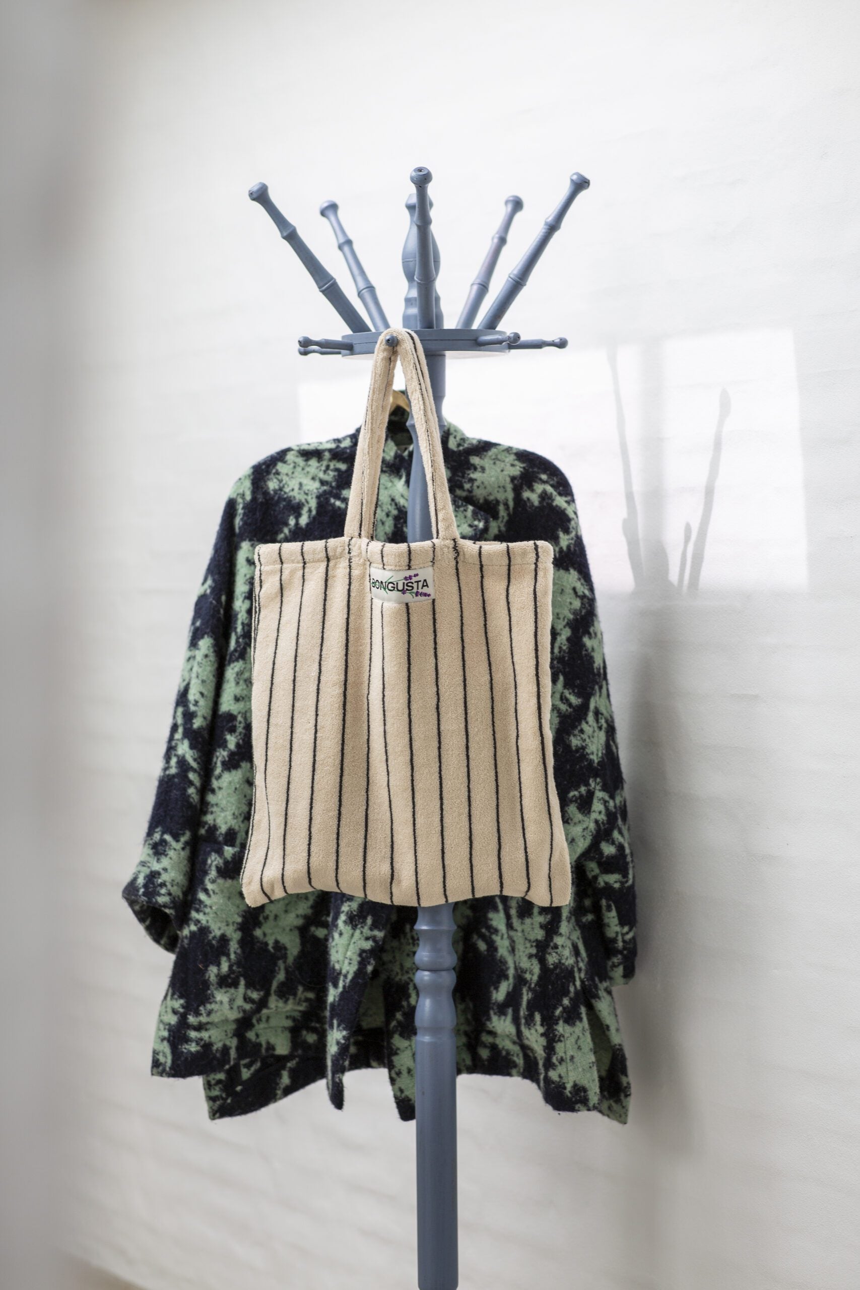 A new take on the classic totebag, made in soft terry towel fabric. The totebag is very soft due to the heavy 600 gram combed cotton weave. Each totebag has a beautifully embroided Bongusta-label on the top part.