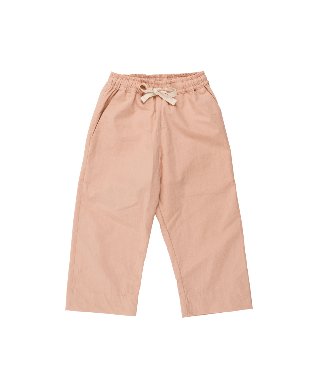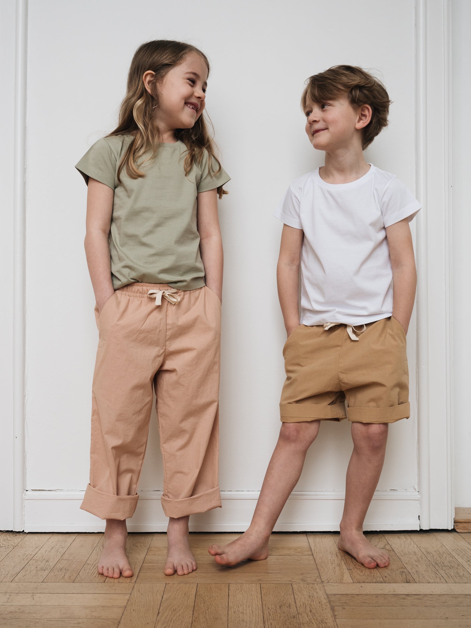 Pants for children in pre-washed GOTS certified organic cotton percale. Elastic waist with cotton drawstring and side pockets. Affordable luxury relaxed pants with an aesthetic look and colour palette. Incredible soft with a washing that gives a very beautiful, understated look and hand feel. French seams inside for a nicer and stronger finish.