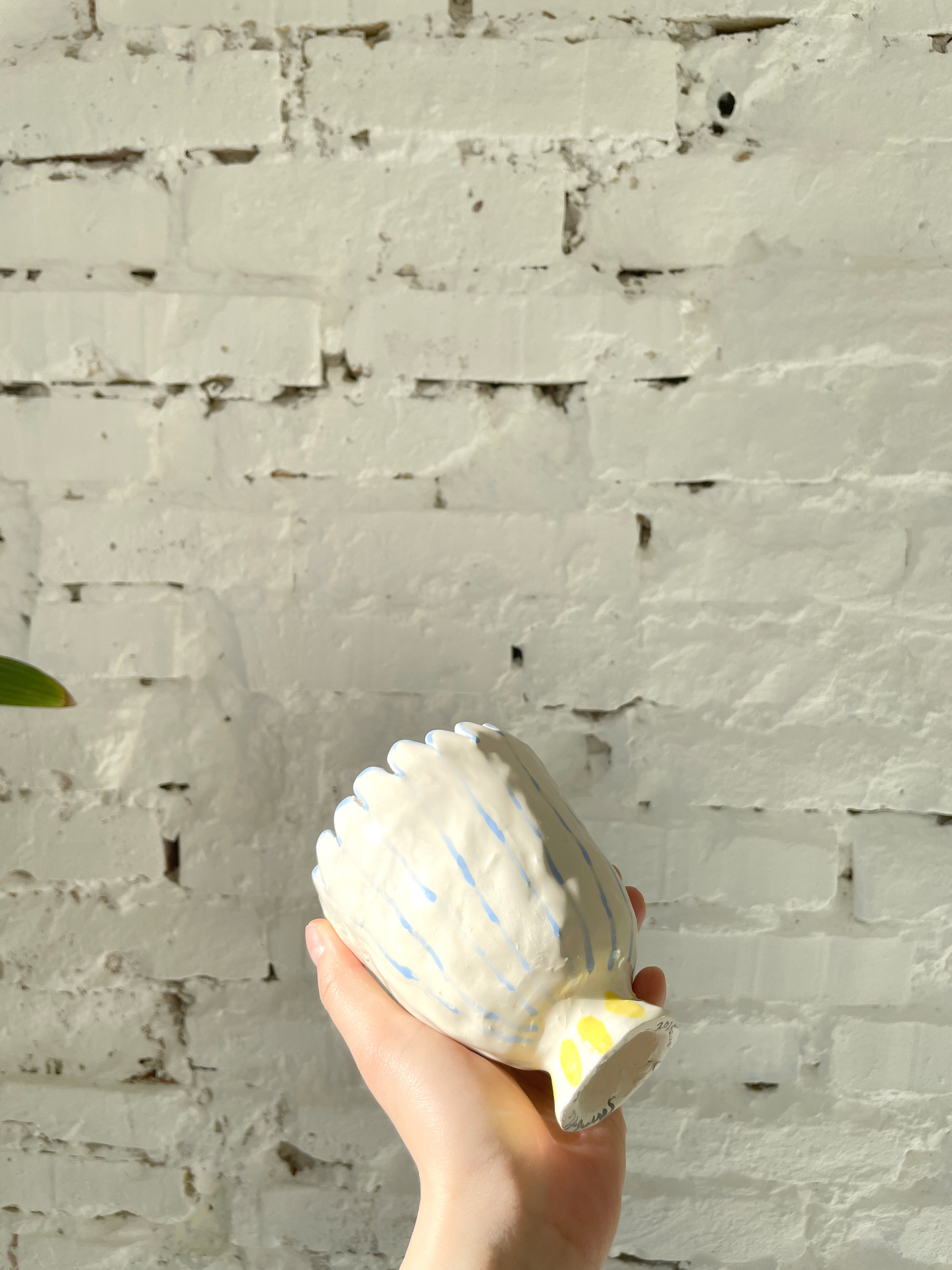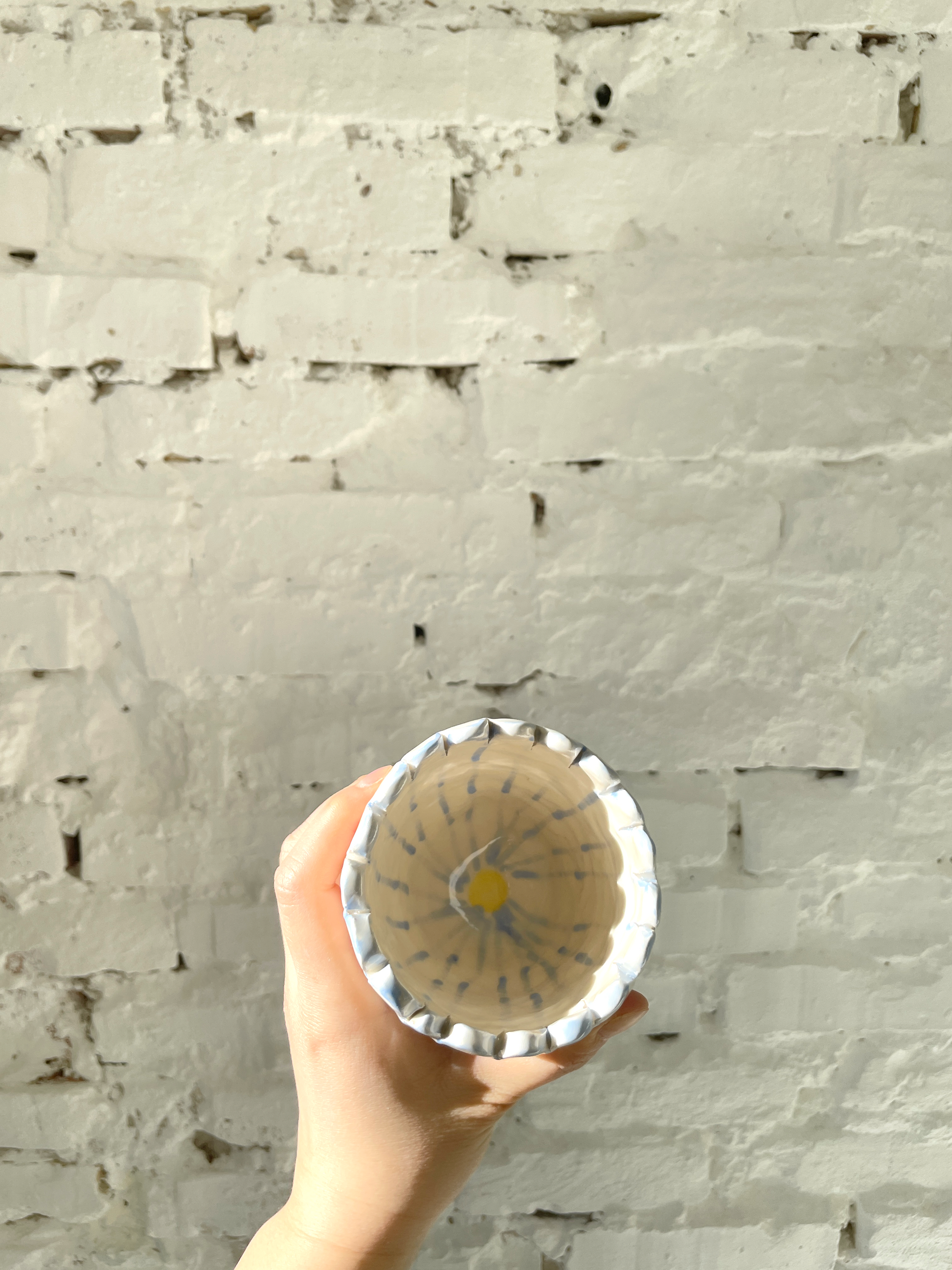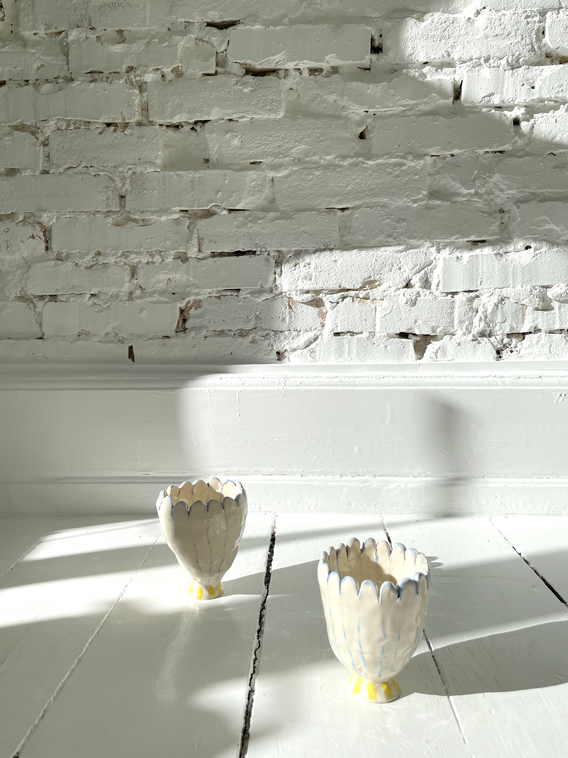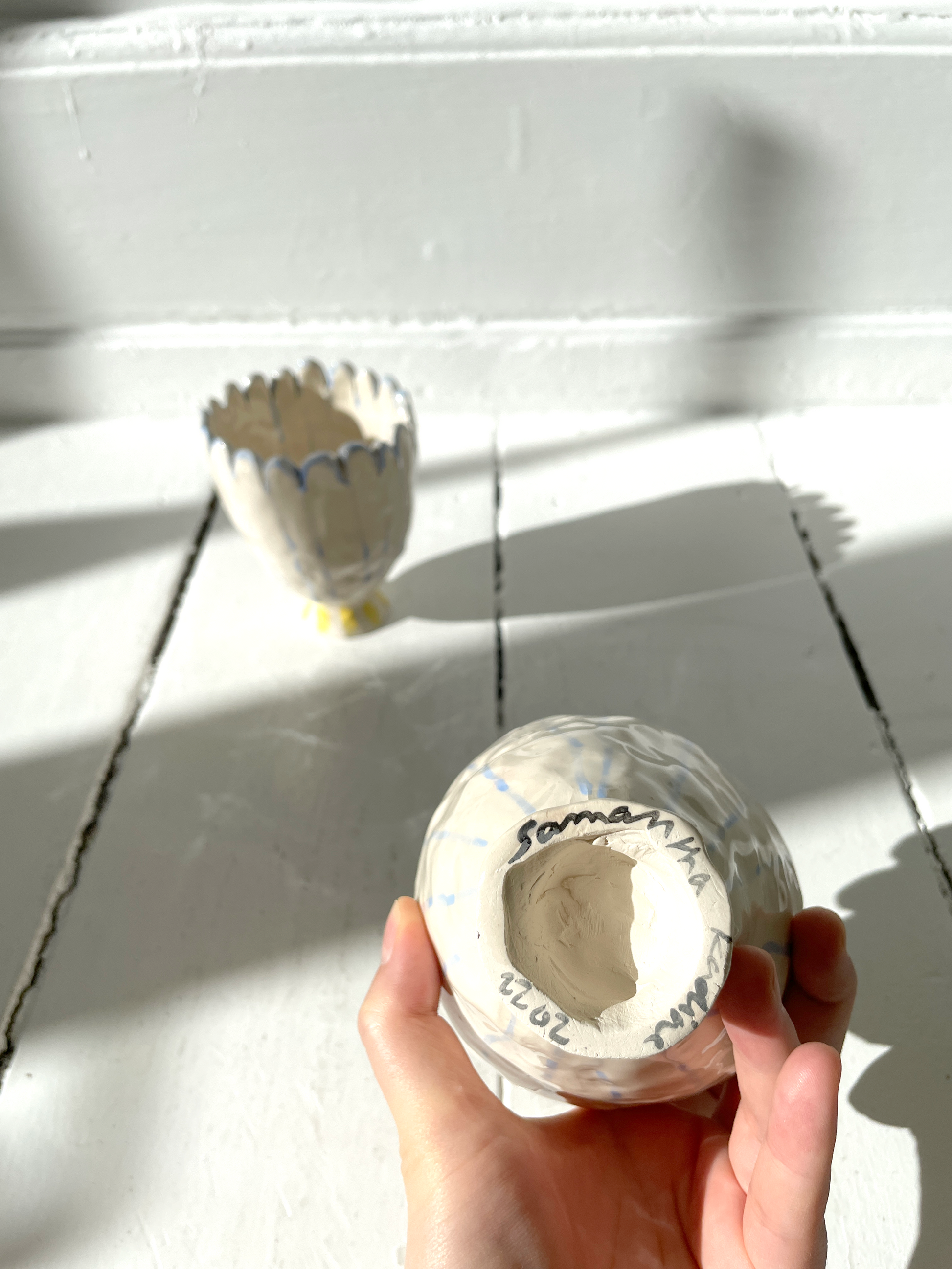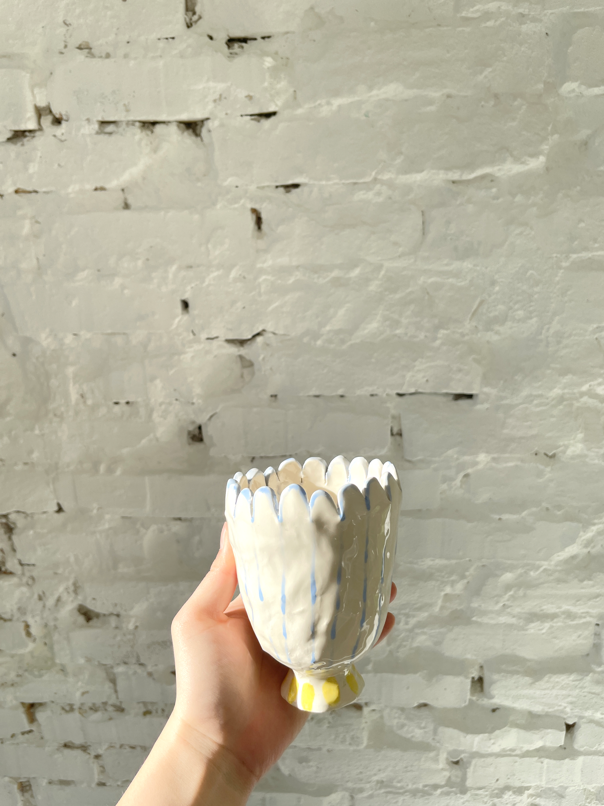 ' 메인 크림 화이트 컬러, 베이비 블루 컬러와 파스텔톤 옐로우 컬러매치, 유니크한 바디감과 디자인, 묵직한 두께, 사만다와 파시만의 감성이 확 느껴지는 플라워 디자인의 유닉한 컵 '