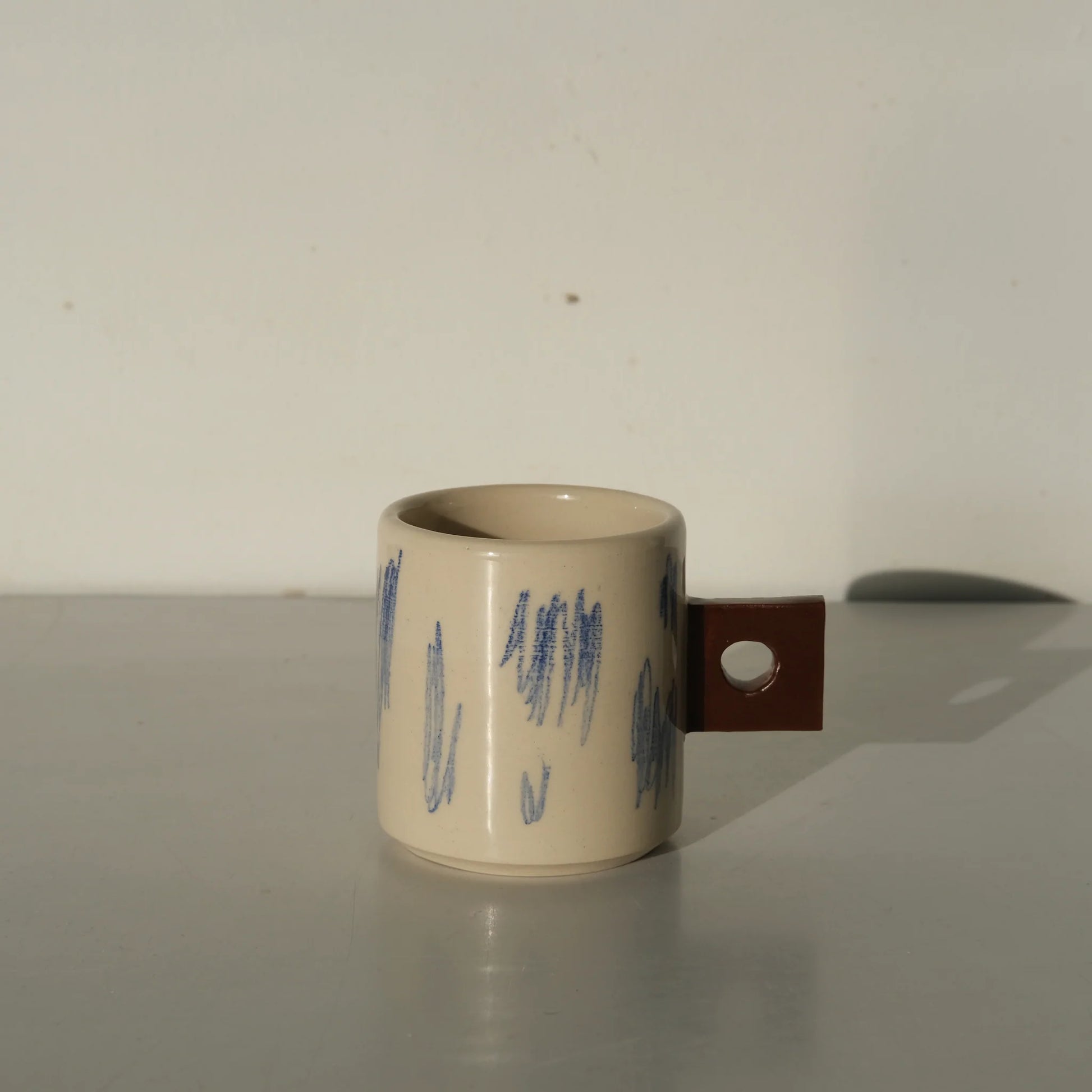 손으로 조각한 손잡이와 장식이 있는 핸드메이드 스크레치 석기 컵. 당신의 에스프레소 커피를 제공하기에 매우 우아하고 유닉한 컵입니다. 약 가로 6 cm x 세로 7 cm, 용량은 110 mL 입니다.