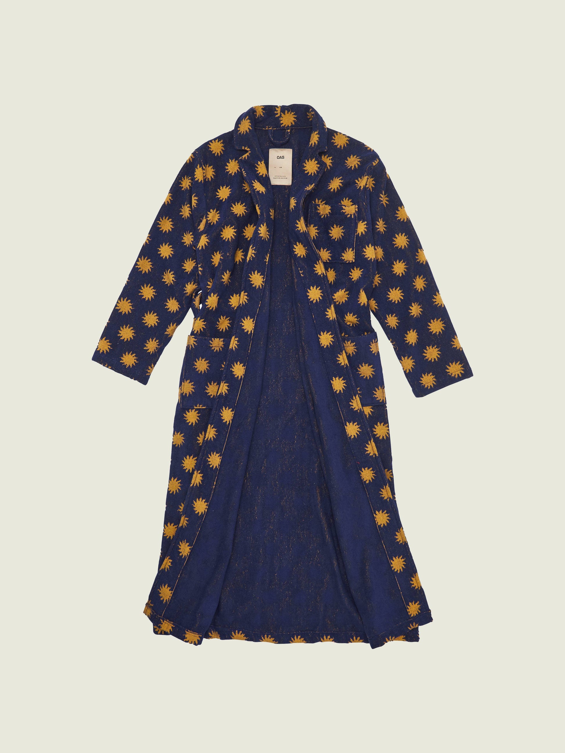 Inspired by sunny Los Angeles the dark blue and warm yellow print lets you take the sun with you wherever you go. Made in a Jacquard-woven terry cotton the Sunday Sun long robe makes for the perfect thing to throw on when the night sky is creeping in.